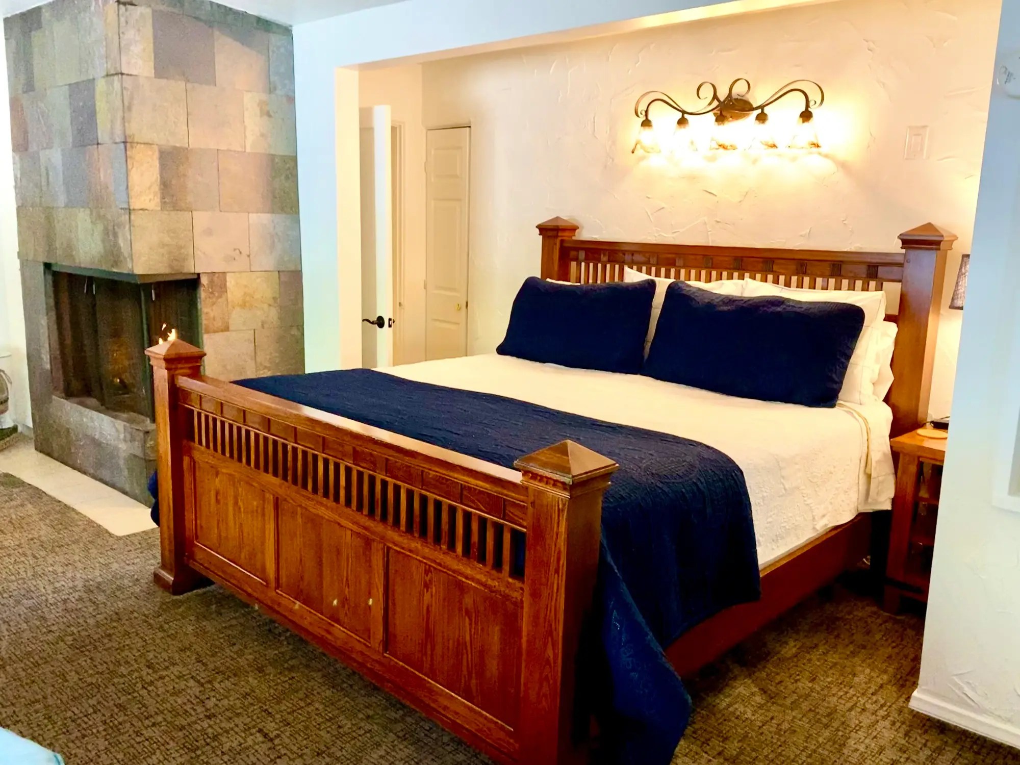 Studio King Suite features fireplace, spacious kitchenette, semi private patio, and large sitting area.